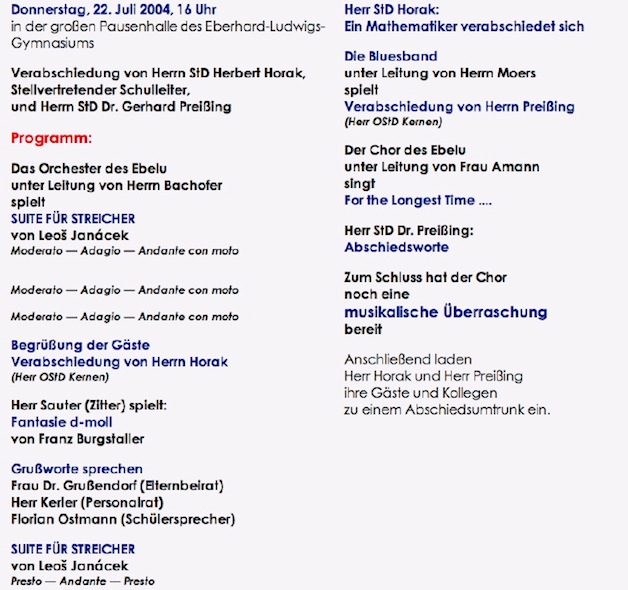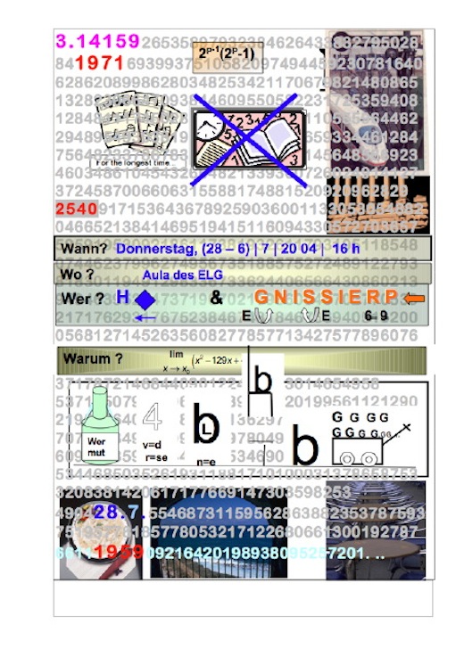 Die Sonderseite für Herrn Horak: Sein denk-würdiges Poster zur Abschiedsfeier. Er greift aus der Zahlenfolge der Zahl Pi einige für sein Leben bedeutsame Zahlenfolgen heraus, legt Erinnerungsbilder darunter und mischt Rebus-Rätsel hinein ("Wer diese Liebe besitzt, besteht alle Gefahren").
