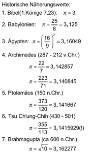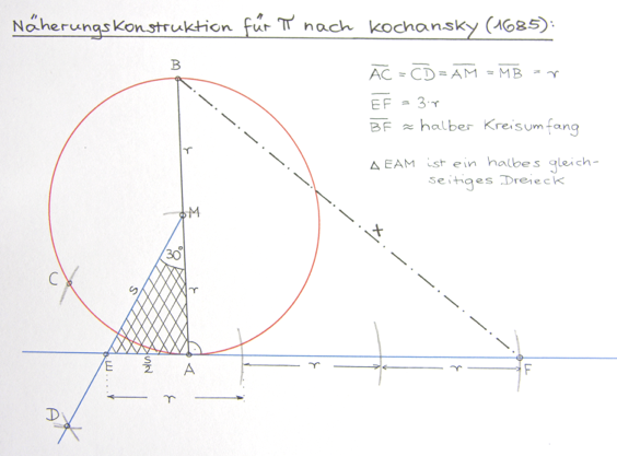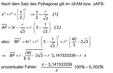 Ein Kreis vom Radius 1 hat den Flächeninhalt π. Die Kantenlänge eines inhaltsgleichen Quadrats müsste dann gleich √π sein. Eine solche Zahl ist mit Zirkel und Lineal nicht exakt konstruierbar. Aus der Fülle der Näherungskonstruktionen sei hier jene von KOCHANSKY genannt: