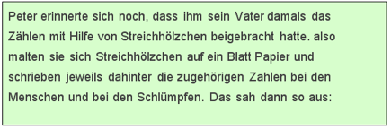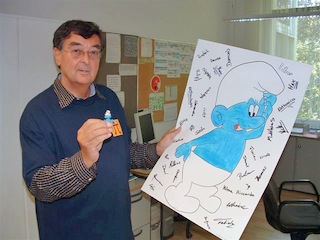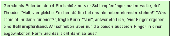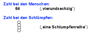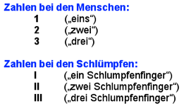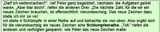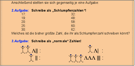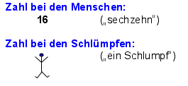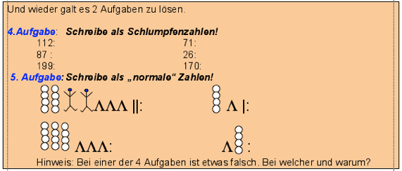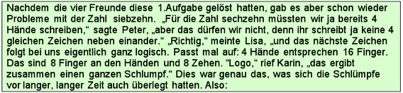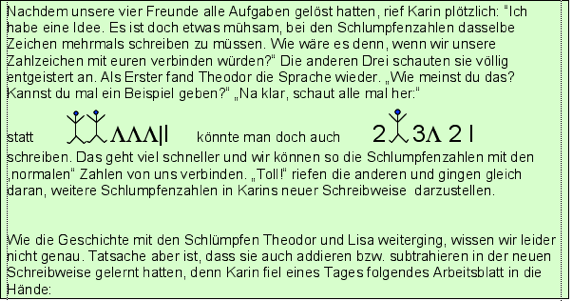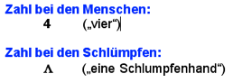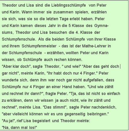 Ausgangspunkt war ein Artikel von Anna-Maria Fraedrich (PH Ludwigsburg), der sich mit der Möglichkeit einer kindgemäßen Einführung in das Vierersystem durch die anschauliche Bezugnahme auf die Welt der Schlümpfe befasste. Schlümpfe besitzen generell nur 4 Finger oder 4 Zehen im Gegensatz zu den Menschen. So entstand in Zusammenarbeit mit meinen Kollegen am ELG eine neue Unterrichtsreihe an Klasse 5, die bei den Schülern auf grosse Resonanz traf ( siehe Abschiedsbild der Klasse 13/2004 nebenan!). Hierbei lernte der Mathe-Schlumpf Theo (im Bild in meiner rechten Hand), wie er in seinem Zahlsystem so rechnen konnte, wie die Schüler in ihrem vertrauten Zehnersystem...